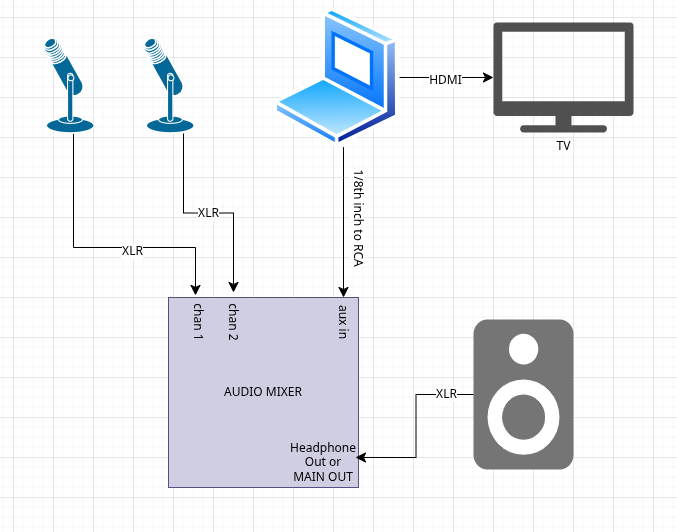 - An audio mixer with at least 1 XLR input, 1 aux input (red + white), a stereo output (can be MAIN LR or headphone out)